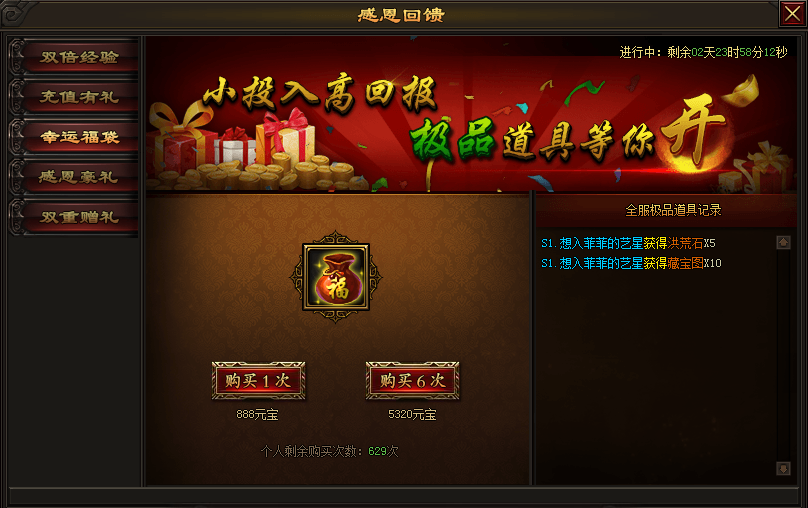 活动内容:活动期间,玩家可花费少量元宝购买超值道具,机不可失,失不再来哦!