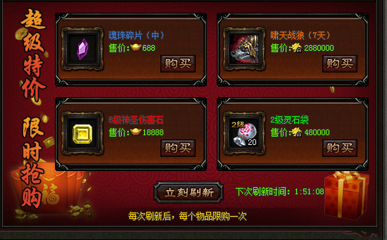活动期间在神秘商店中会刷出众多低价极品道具,更有非商城出售道具出现。超低折扣,买多赚多