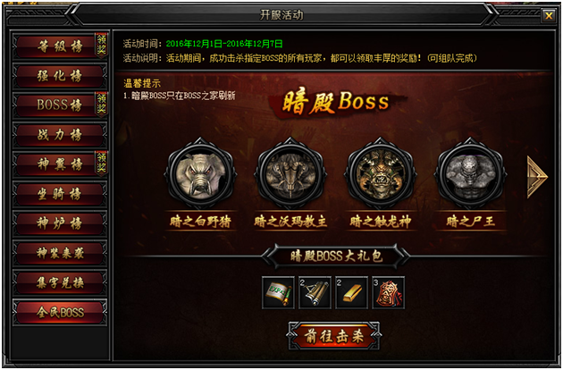 全民奖励分等级,强化,BOSS积分,战力,神翼,坐骑,神炉;相应等级达到要求即可领取奖励,越高级的奖励数量越稀有,先到先得。