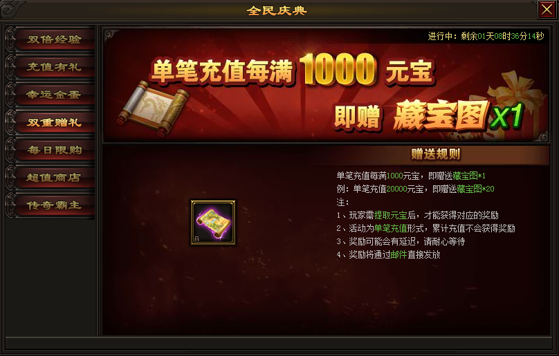 活动时间:2016年12月21日00:00~11月22日23:59活动内容:活动期间,单笔充值每满1000元宝,即赠藏宝图*1,多充多送哦!