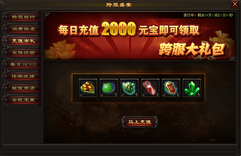 活动期间,每日充值2000元宝即可领取超值奖励!