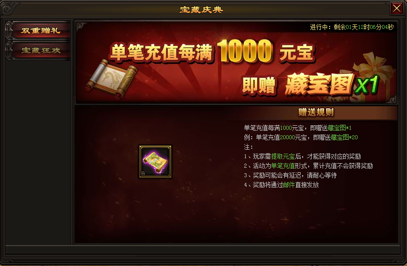 活动内容:每充值1000元宝即可获得藏宝图*1.多充多送哦!