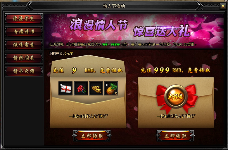 1.玩家可通过赠送情书表达爱意,收得情书达到799时,可领取多情公子或万人迷称号及物品奖励