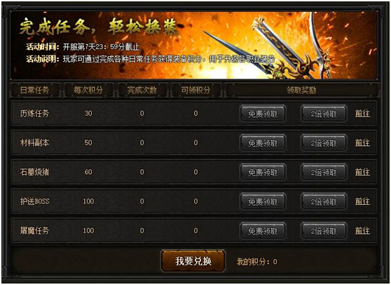 【活动内容】活动期间,完成日常任务即可获得装备积分,装备积分可用于升级武器、衣服、坐骑、翅膀等,应有尽有,快来升级吧~