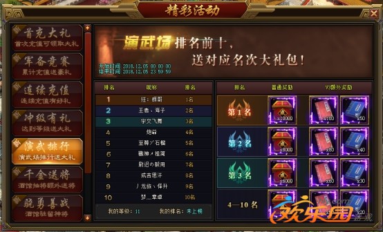 开服5~7天,演武排行前十名将获得威望奖励, VIP3及以上还将额外获得经验书和兵书奖励。
